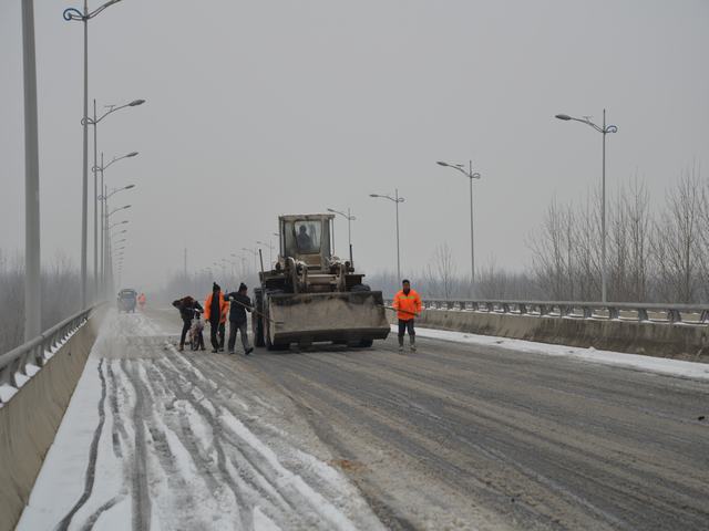 組織開展了除雪防滑實戰(zhàn)演練,規(guī)范了一系列工作流程,促進(jìn)了除雪保暢工作落實。成立了除雪保暢應(yīng)急領(lǐng)導(dǎo)小組,實行 24 小時值班制度和天氣預(yù)警制度,并加強同高速交警、路政、氣象等部門的聯(lián)系,提前儲備了充足的融雪劑、除雪鏟車、應(yīng)急運輸車和其他勞動保護(hù)用品,包括反光衣、手套、安全帽等,一但突發(fā)險情,立即投入使用。當(dāng)所轄路段開始下雪時,公司第一時間啟動應(yīng)急預(yù)案,全體養(yǎng)護(hù)人員迎難而上,克服時間緊迫,組織緊張、任務(wù)艱巨及持續(xù)時間長、工作強度大等重重困難,在連續(xù)數(shù)天的除雪保暢工作中,全體人員充分發(fā)揚反應(yīng)迅速、不畏艱險、吃苦耐勞和連續(xù)作戰(zhàn)的工作作風(fēng),圓滿完成除雪保暢任務(wù),確保了全路段車輛的正常通行。