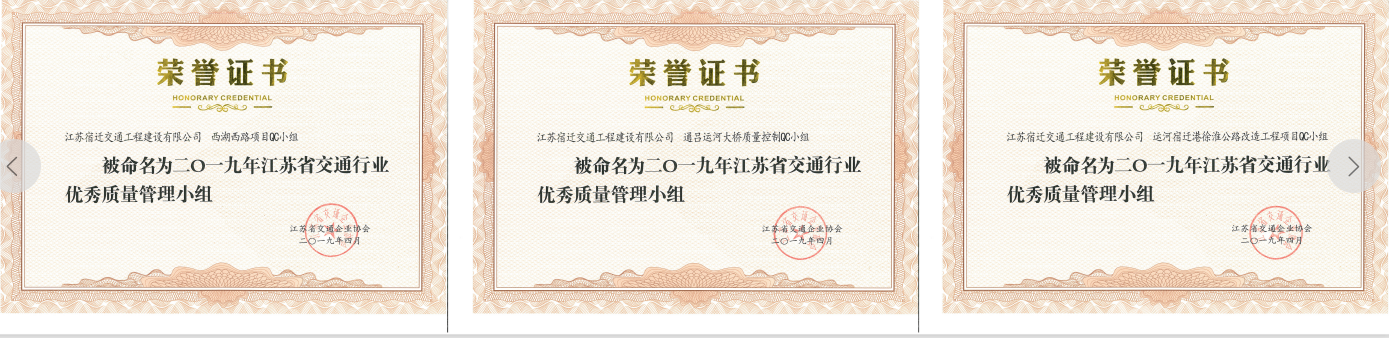 近日,公司“西湖西路項(xiàng)目QC小組”、“運(yùn)河宿遷港徐淮公路改造工程項(xiàng)目QC小組”和“通呂運(yùn)河大橋質(zhì)量控制QC小組”被江蘇省交通企業(yè)協(xié)會授予“2019年度江蘇省交通行業(yè)優(yōu)秀質(zhì)量管理小組”稱號。