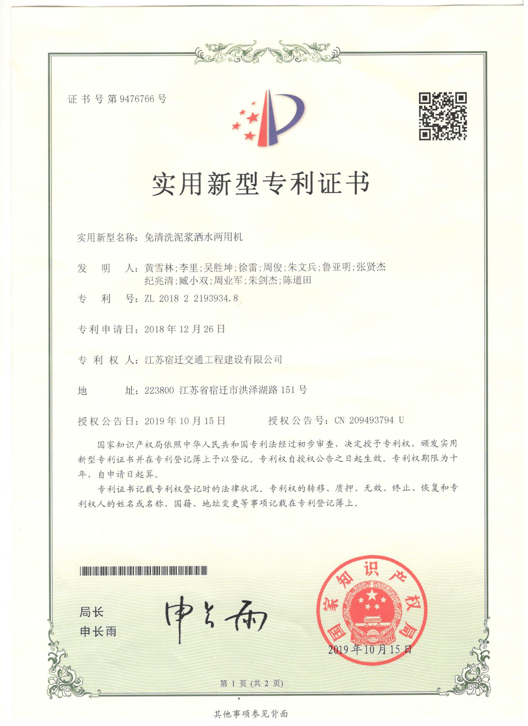 近日,公司又一項(xiàng)發(fā)明專利——“免清洗泥漿灑水兩用機(jī)”獲得國(guó)家知識(shí)產(chǎn)權(quán)局授權(quán),并取得專利證書。