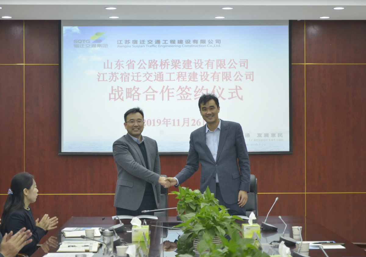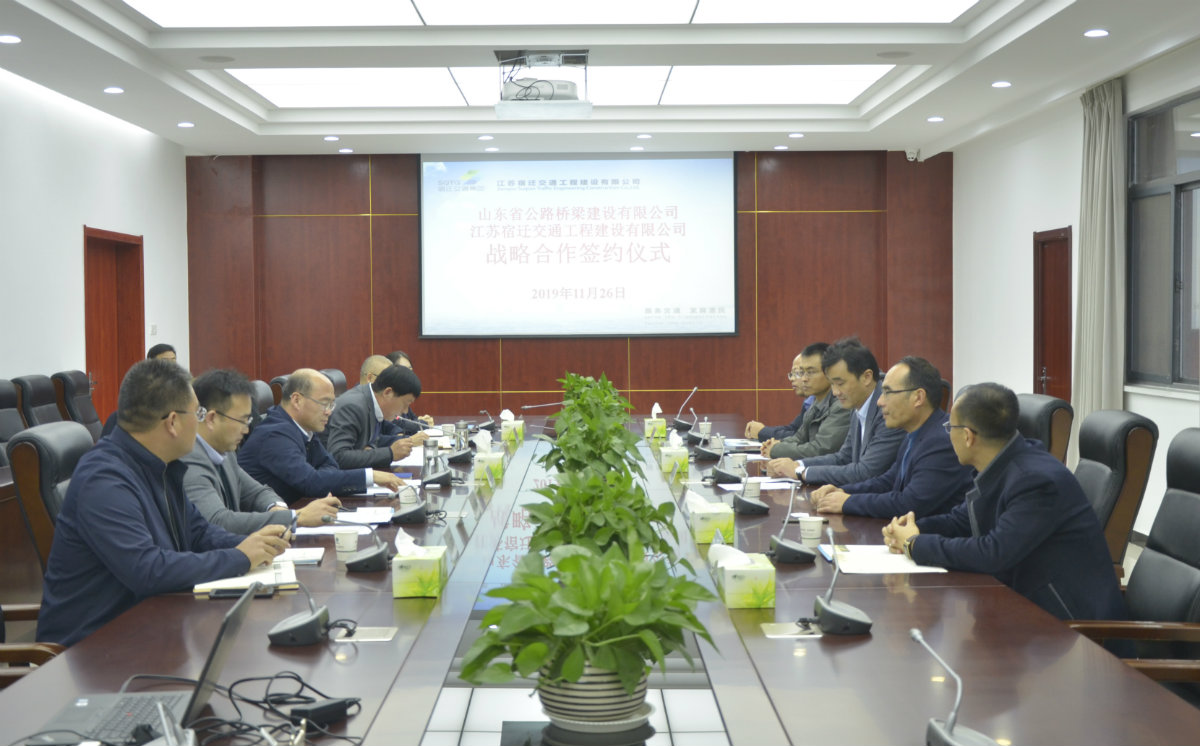 11月26日下午,公司與山東省公路橋梁建設(shè)有限公司戰(zhàn)略合作簽約儀式在機(jī)關(guān)三樓會(huì)議室舉行。山東省公路橋梁建設(shè)有限公司黨委書(shū)記、董事長(zhǎng)張濤,宿遷交通集團(tuán)黨委書(shū)記、董事長(zhǎng)劉飛,副總經(jīng)理黃雪林出席簽約儀式。
