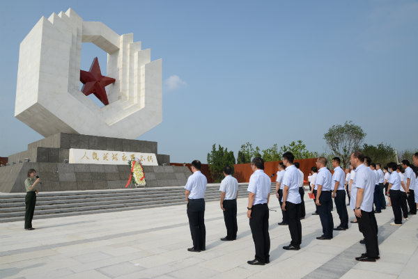 在宿北大戰(zhàn)人民紀念碑前,全體肅立,奏唱國歌,黨員代表敬獻花籃,向革命先烈致默哀,重溫入黨誓詞。穿過歷史長廊,一幅幅新四軍帶領中國人民浴血奮斗的畫面悠然眼前,聆聽著革命先烈們的傳奇一生,內心深深被震撼,紅色情懷愈加深邃。