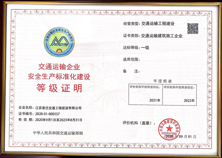 在公司領(lǐng)導(dǎo)高度重視和專題部署下,經(jīng)公司相關(guān)部門及參創(chuàng)項目的不懈努力,歷經(jīng)自主創(chuàng)建、專家指導(dǎo)、自評、考評機構(gòu)考察審核等階段,公司于2020年8月順利通過交通運輸建筑施工企業(yè)安全生產(chǎn)標準化一級換證評價審核。