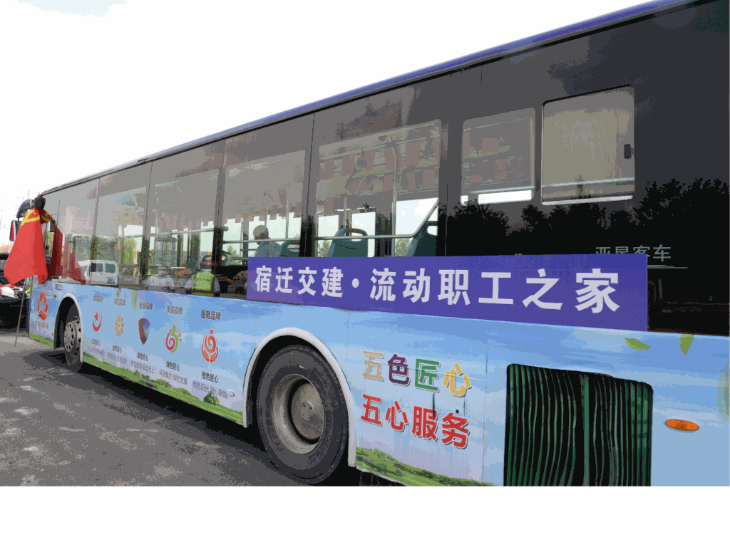 啟動(dòng)儀式上,宿遷交建首個(gè)“公交式”流動(dòng)職工之家正式啟用。車內(nèi)設(shè)置17張獨(dú)立座椅、三張餐桌,配有空調(diào)、冰箱、飲水機(jī)、應(yīng)急藥箱以及容納280本書籍的紅書角。為施工一線職工提供用餐、休息、學(xué)習(xí)場所。車身外觀展示的是公司的文化主品牌“工于匠心 建領(lǐng)未來”及子品牌“五色匠心”,其中黨總支“匠心筑路黨旗紅·交建先鋒”品牌符號(hào)。位于車身顯著位置,彰顯品牌力量。