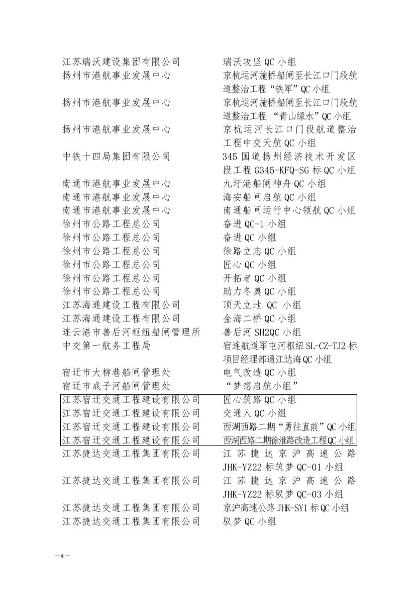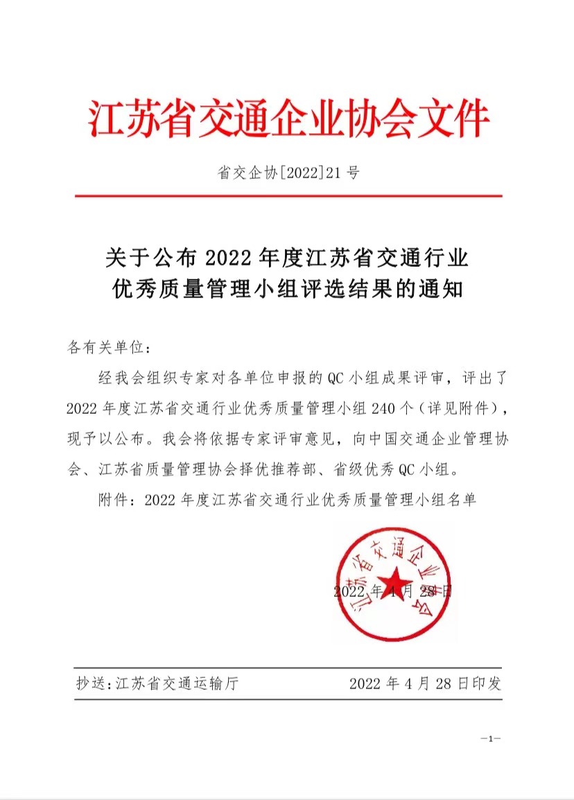 近日,從江蘇省交通企業(yè)協(xié)會(huì)傳來喜報(bào),公司西湖西路二期徐淮路改造工程項(xiàng)目QC小組、西湖西路二期“勇往直前”QC小組、匠心筑路QC小組、交通人QC小組榮獲“2022年江蘇省交通行業(yè)優(yōu)秀質(zhì)量管理小組”稱號(hào)。
