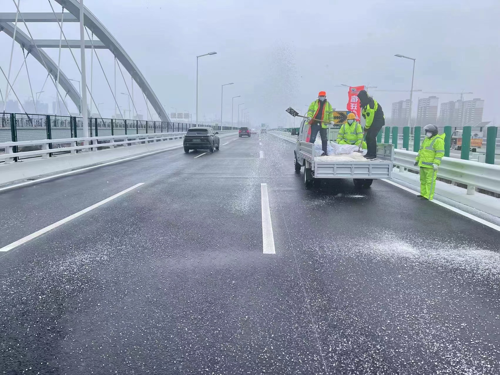 此次除雪行動(dòng),養(yǎng)護(hù)分公司出動(dòng)上百名養(yǎng)護(hù)人員,對(duì)北京路、洋河大道、上海路等養(yǎng)護(hù)路段的高架橋梁、上下匝道、急彎、陡坡等易凍易滑路段及時(shí)撒布融雪劑,及時(shí)對(duì)結(jié)冰、積雪路段進(jìn)行破冰清除。截至目前,共出動(dòng)高壓水車(chē)4臺(tái)、掃雪車(chē)1臺(tái)、拋雪車(chē)1臺(tái)、融雪撒布車(chē)1臺(tái)、自卸運(yùn)輸車(chē)3輛、裝配卡車(chē)4臺(tái)、巡視車(chē)輛8臺(tái),消耗防滑石子1000噸,融雪劑80噸,融雪鹽150噸,出動(dòng)除雪人員130人次,目前各高架橋梁、養(yǎng)護(hù)路段均通行暢通。