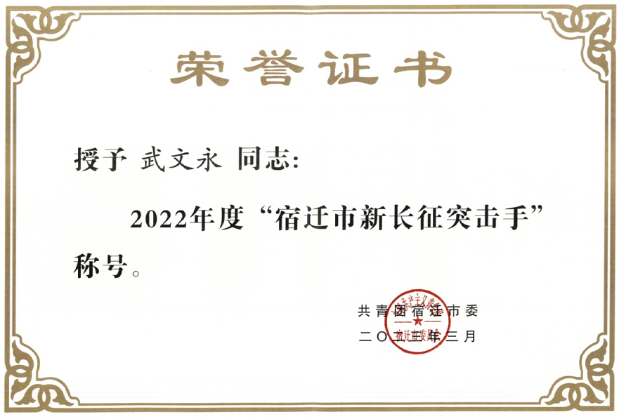 近日,由團(tuán)市委組織開(kāi)展的2022年度宿遷市新長(zhǎng)征突擊手評(píng)選活動(dòng)結(jié)果出爐,公司武文永被授予“宿遷市新長(zhǎng)征突擊手”稱號(hào)。