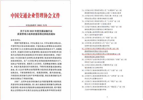 近日,宿遷交建“交通人QC小組”和“舒適道路QC小組”被中國交通企業(yè)管理協(xié)會授予“2023年度交通運輸行業(yè)質量管理小組”稱號。