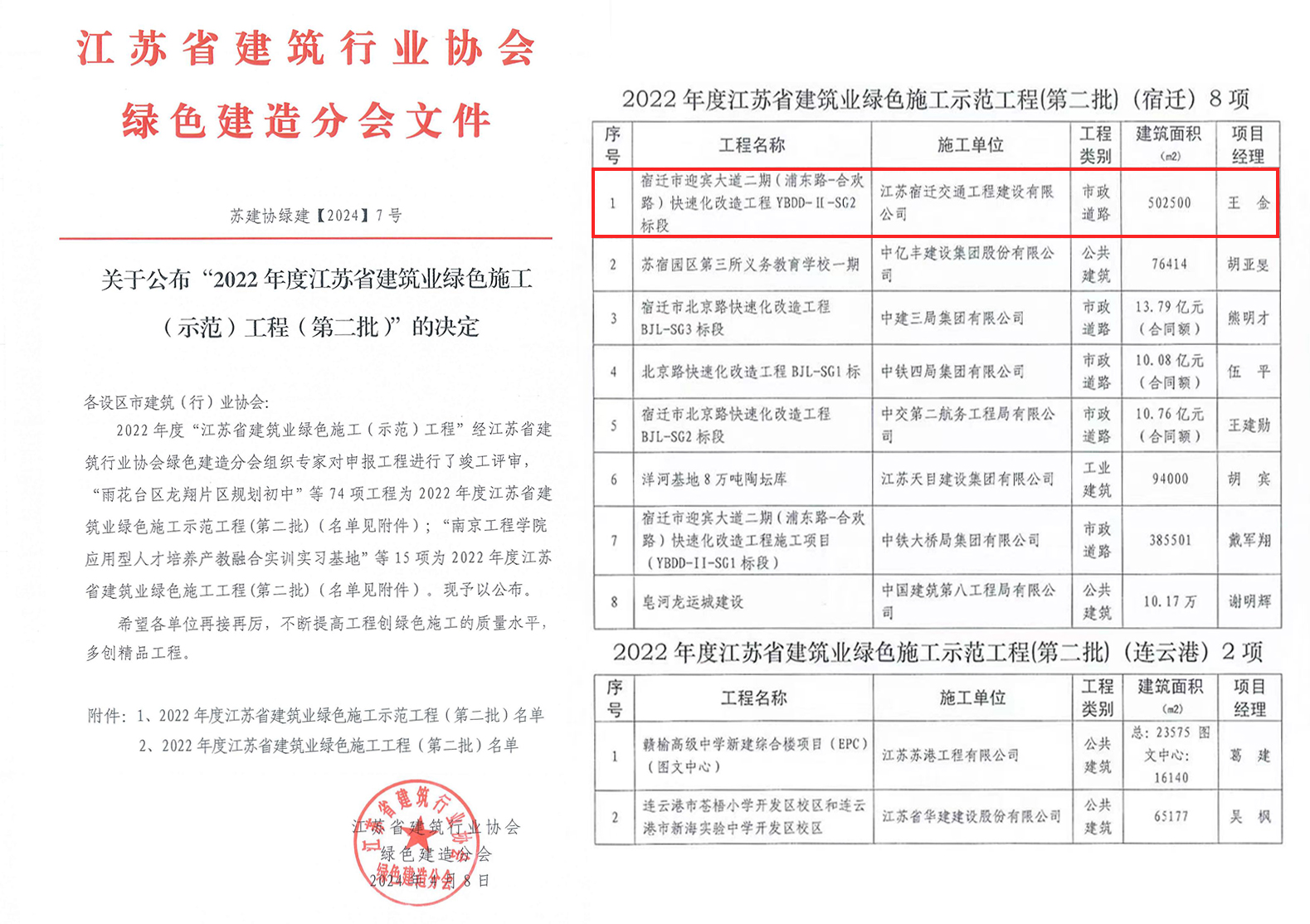近日,江蘇省建筑行業(yè)協(xié)會(huì)頒布《2022年度江蘇省建筑業(yè)綠色施工(示范)工程(第二批)的決定》,由宿遷交建承建的迎賓大道快速化改造工程項(xiàng)目喜獲2022年度江蘇省建筑業(yè)綠色施工示范工程(第二批)榮譽(yù)。