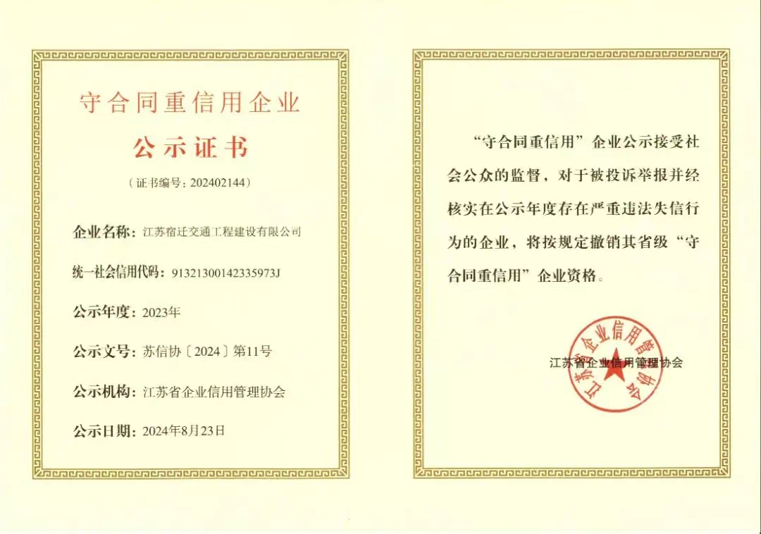 近日,江蘇省企業(yè)信用管理協(xié)會(huì)(蘇信協(xié)〔2024〕第11號(hào))發(fā)布《江蘇省企業(yè)信用管理協(xié)會(huì)關(guān)于2023年度省級(jí)“守合同重信用”企業(yè)公示的公告》,宿遷交建榜上有名,這是公司自2008年度以來(lái)蟬聯(lián)該稱號(hào)。
