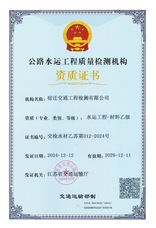 近日,經(jīng)江蘇省交通運輸廳審批,宿遷交通工程檢測有限公司(簡稱交通檢測公司)成功獲得了公路水運工程質(zhì)量檢測機構(gòu)水運工程材料乙級資質(zhì)證書。