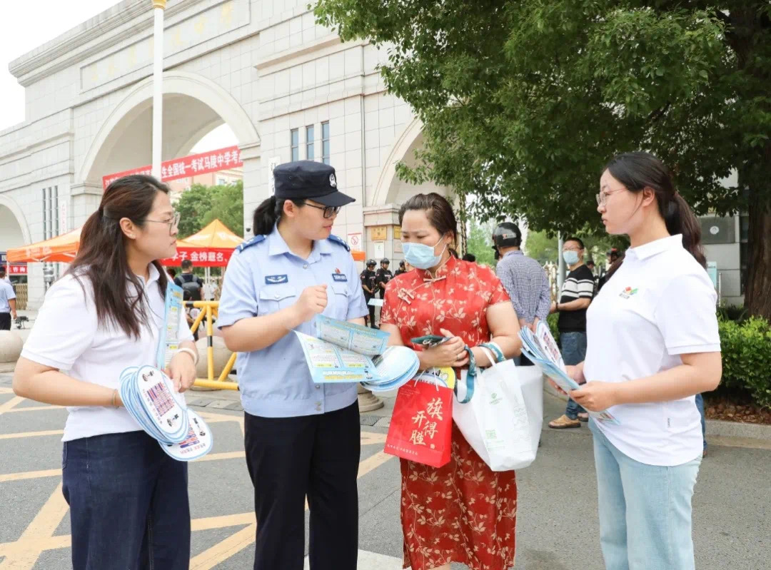 活動期間,在宿遷市馬陵高中考點設(shè)立的高考志愿服務(wù)站成為一道溫暖的風(fēng)景線。志愿者們有序為考生、家長及考務(wù)人員發(fā)放礦泉水、扇子等防暑物資,同時精心準(zhǔn)備反詐宣傳單頁,以通俗易懂的語言講解高考詐騙常見套路??紤]到家長陪考需求,工作人員熱情引導(dǎo)家長至遮陽帳篷內(nèi)休息,并開展反詐知識宣講,既緩解家長焦慮情緒,又筑牢防詐安全網(wǎng),用細致入微的后勤服務(wù)為考生夢想之路保駕護航。